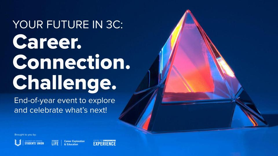 UTSU, CIE, CxED & Student Life present Your Future in 3C! Connect with alumni, explore careers, enjoy food, mocktails & headshots.